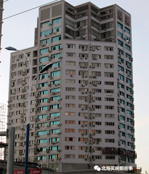西南大道和云南路交汇处的碧海豪庭,空调外机预留位置简炼美观又实用,是北海楼盘在此方面比较成功的设计。但注意图中上半部分(白色外墙)和下半部分(橙色外墙)的设计区别——上半部分因为没有预留到空调外机的安装位置,结果空调一安装,建筑外型就被破坏了。