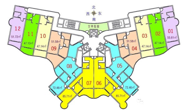 这个是形象的蝶式塔楼。塔楼的特点是方方正正厚厚实实。板楼可以做到南北朝向、南北通透,塔楼就只能无可奈何了。