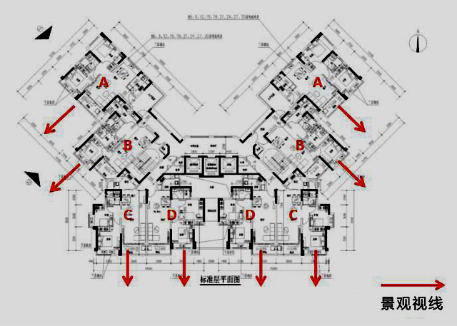 碧桂园的高层住宅楼多以这样的变形品字楼为主,三梯8户。这种楼型如今在北海渐渐増多,因为除了増加景观视线之外,更重要的可以増加每层的户数。只是这样的楼型,再也没有方方正正南北通透。尤其是朝南的户型,北侧已经是密不透风。