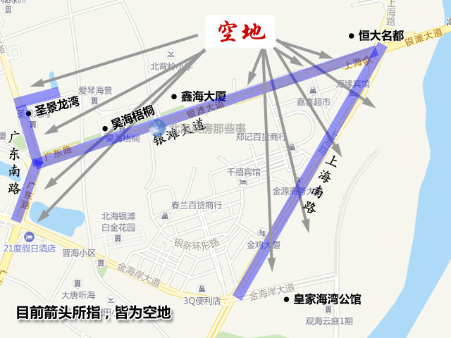 北海城区目前有相当数量的零零星星空地块,杂草丛生闲置多年。“地主”究竟是谁、地块是何用途糊里糊涂。但上图箭头所指位置都是住宅用地或商住用地。种种迹象表明,这些空地在8月份有可能会发生重大的变化,或挂牌出售、或平整土地、或准备开工。毫无疑问,这些变化将直接影响着这几个楼盘的地段价值。