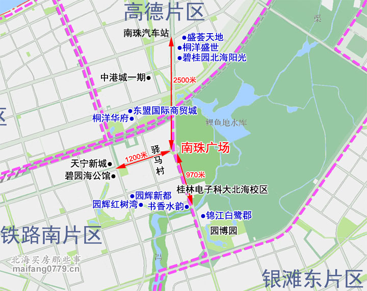 其次是园辉新都、园辉红树湾、碧桂园北海阳光、桐洋盛世花园等等,到南珠广场2公里左右,步行到广场不大现实,但骑车过去还是很方便。