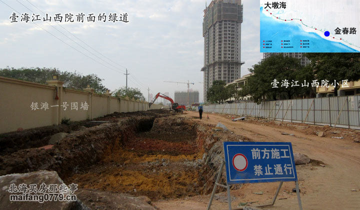 银滩西区绿道(荣和至壹海江山)现在封闭施工中,进不去。还好,东投银滩海玥台售楼中心前面有个缝隙可以伸手出去拍照。拍出来的施工现场图是这样。