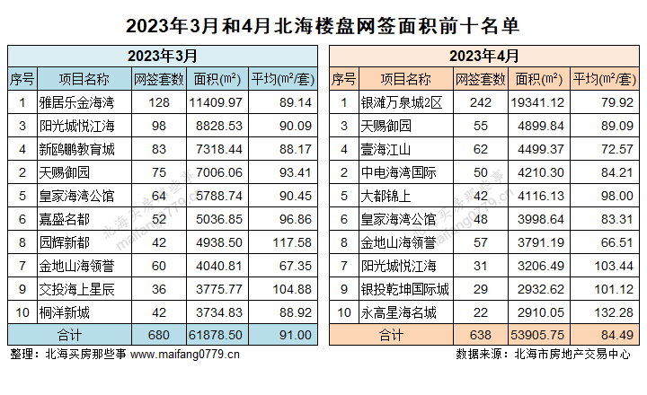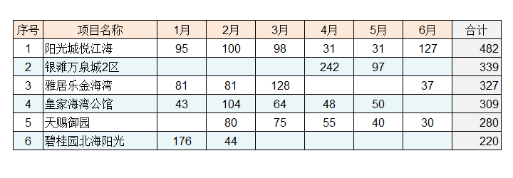 北海市房地产交易中心每个月都有一个“新建商品住房网签面积前十”项目排行榜。今年1-6月榜单如下(可以先跳过不看):