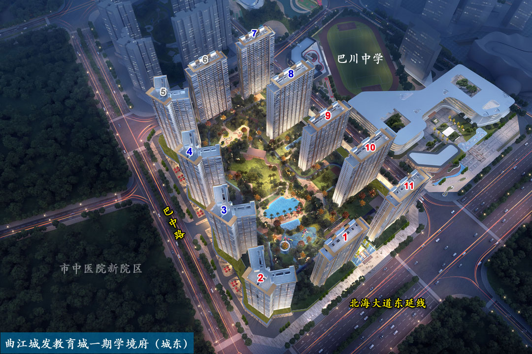 曲江城发教育城一期(学境府),位于北海大道东延线与巴中路交汇处东北角,西边是市中医医院(新院区,在建)。