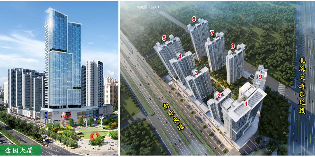 金园大厦,位于南珠大道与北海大道东延线交汇处东北角、南珠汽车站东边。项目已经全部建成,现房在售。