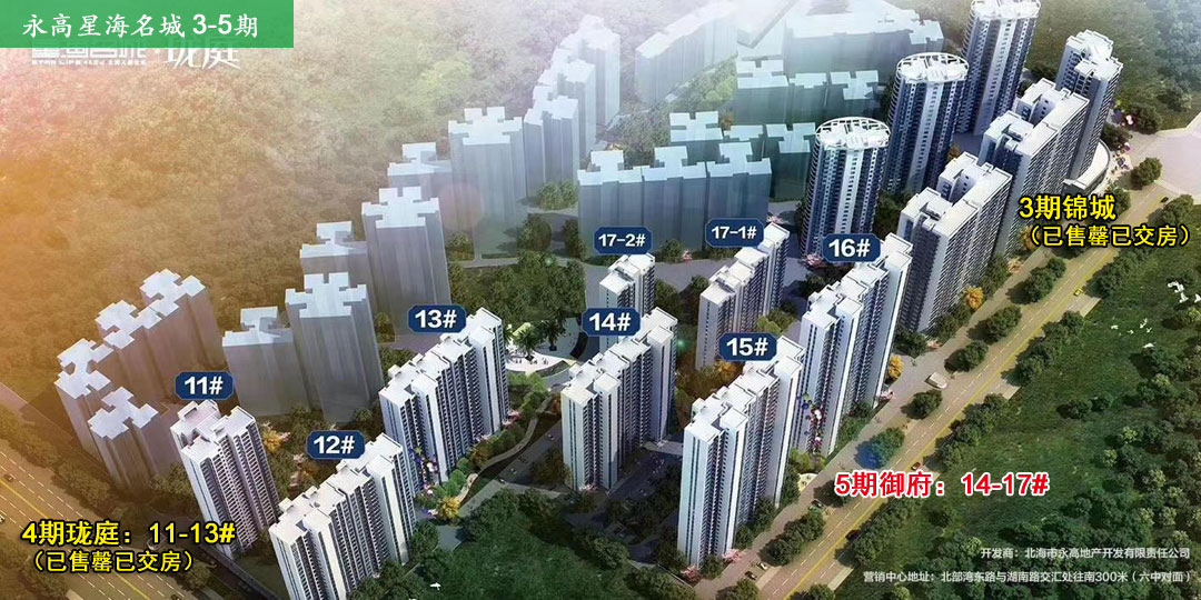 永高星海名城,3-5期连在一起,位于海南路南侧、北星路至湖北路。小区东北方向是北海六中。