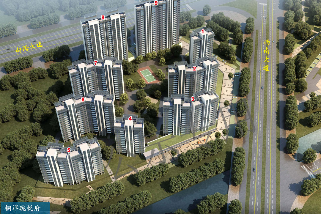 桐洋和悦府、桐洋珑悦府也是一对邻居和兄弟楼盘,位于向海大道与西南大道交汇处。标有楼号的楼栋已经建成。