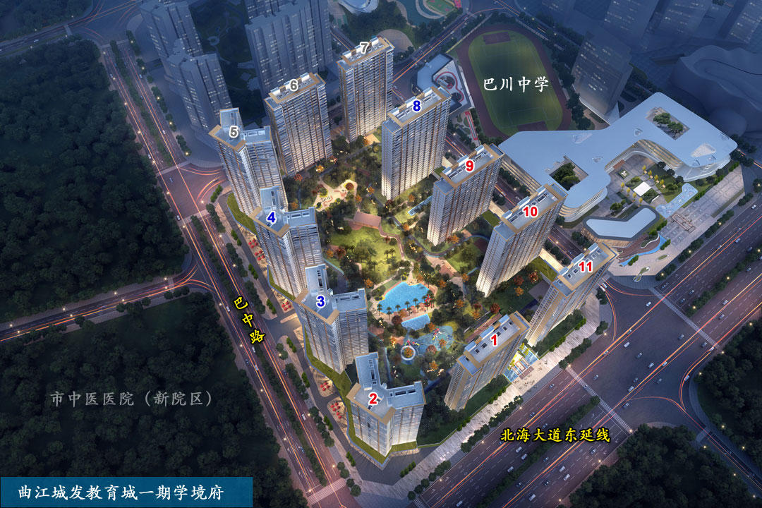 曲江城发教育城一期(学境府),位于北海大道东延线与巴中路交汇处东北角,西边是市中医医院(新院区,在建)。