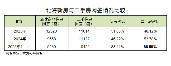 2025年1-11月,北海新房卖出5230套,二手房成交10422套。