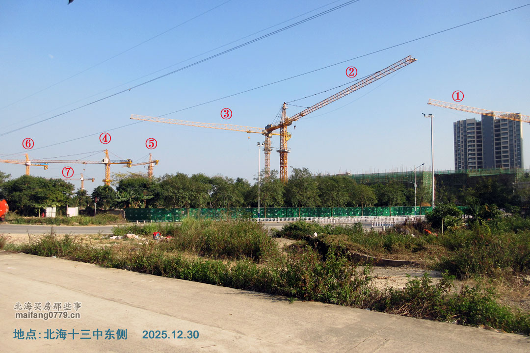 位于南珠大道北海十三中东侧的一个楼盘工地,一口气耸立了7座塔吊: