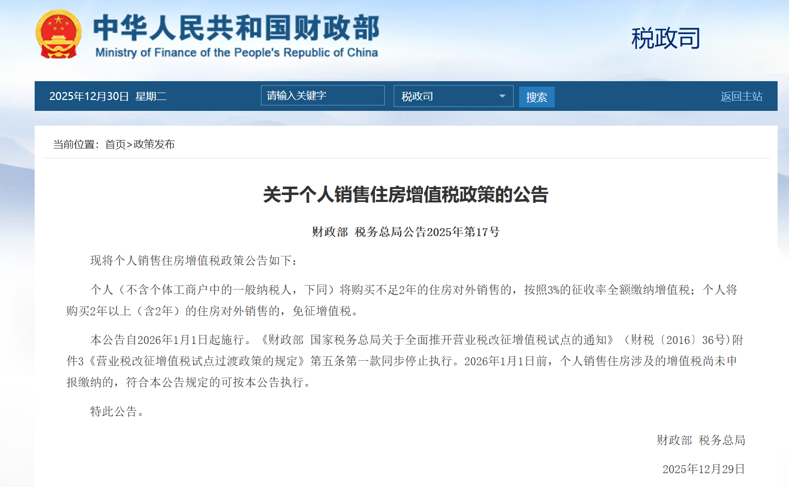 财政部网站2025年12月30日消息,财政部、税务总局发布公告,个人(不含个体工商户中的一般纳税人,下同)将购买不足2年的住房对外销售的,按照3%的征收率全额缴纳增值税;个人将购买2年以上(含2年)的住房对外销售的,免征增值税。